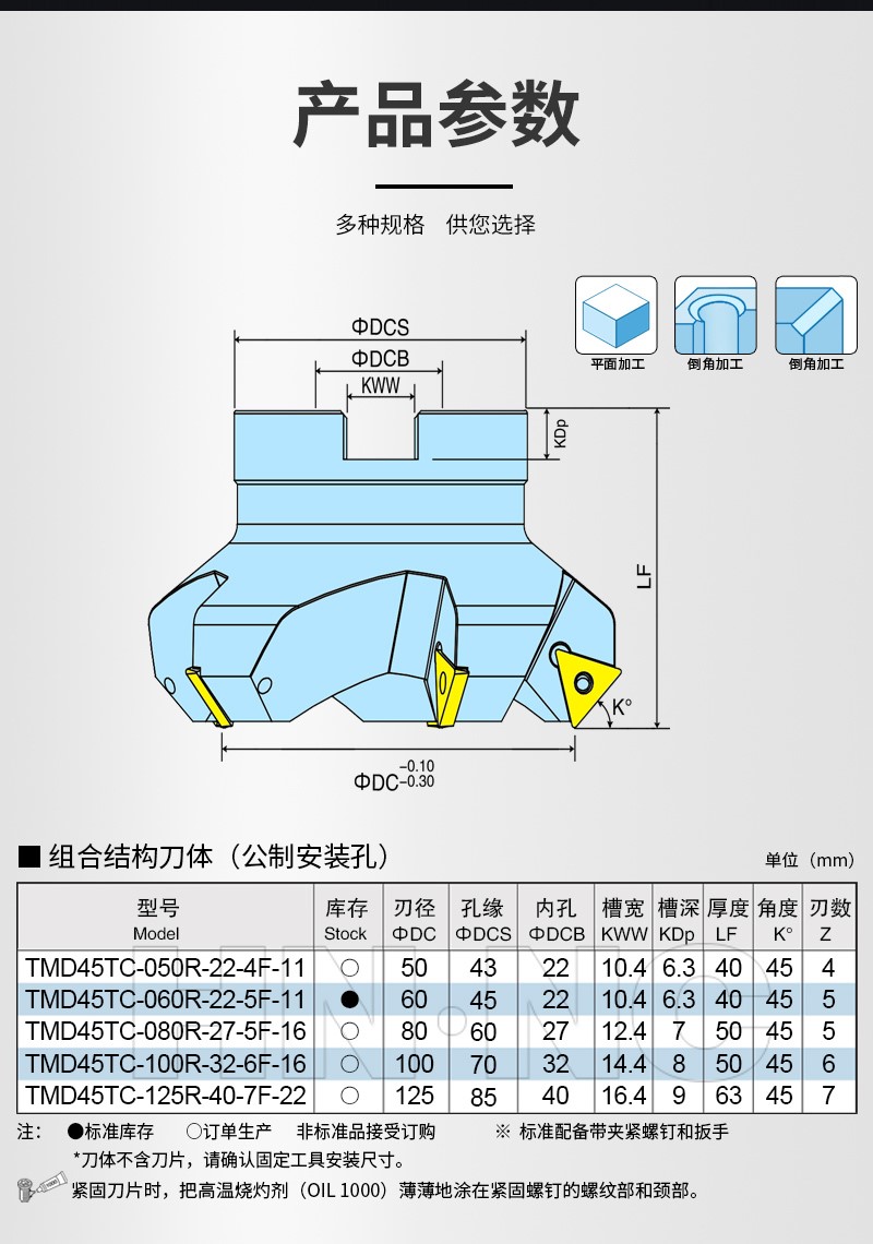 海纳TMD45TC-060R-22-5F-11平面精加工方肩铣刀盘45度直角铣刀盘